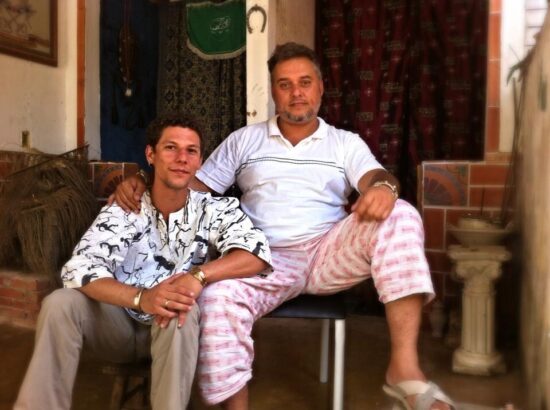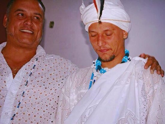 À esquerda, Babalorixá Caccioli de Ayrá e à direita Babalorixá Lucas de Odé, em comemoração aos 14 anos de Oxossi, em 2014. Foto: Arquivo